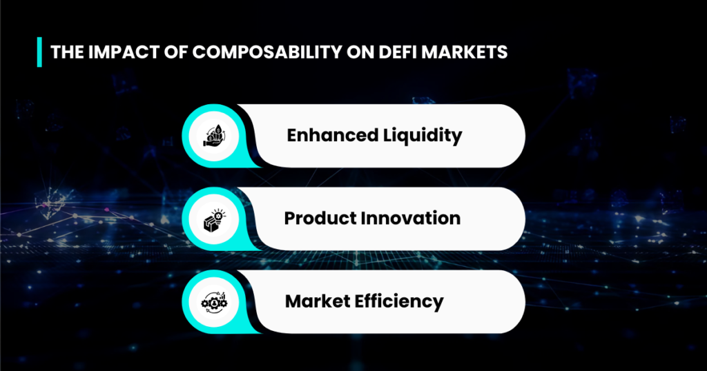 - Composability enhances liquidity, encourages product innovation, and improves market efficiency by reducing transaction costs.