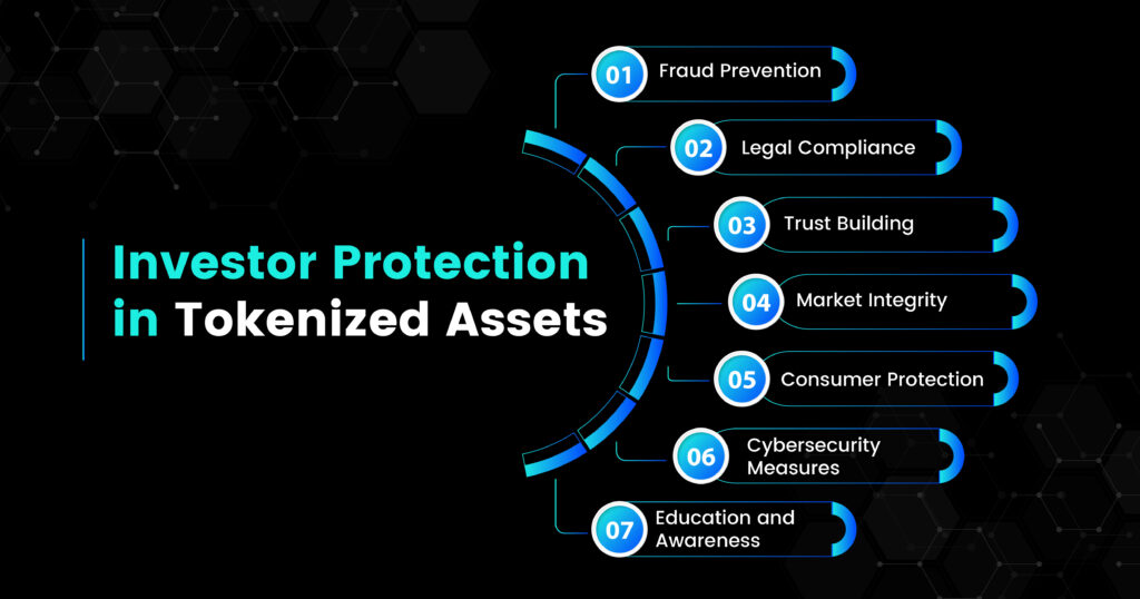 - Investor protection in tokenized assets helps in preventing fraud, maintaining legal compliance, and building trust and market integrity.
