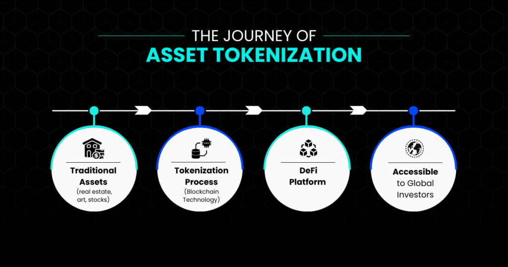 DeFi asset tokenization is a term that refers to the process of creating digital tokens representing their ownership rights on a blockchain, removing intermediaries in a decentralized ecosystem. It uses smart contracts. Furthermore, it highlights the wider DeFi framework of encouraging an inclusive environment. This allows stakeholders including investors and traders to invest, trade, and manage tokenized assets without any dependency.